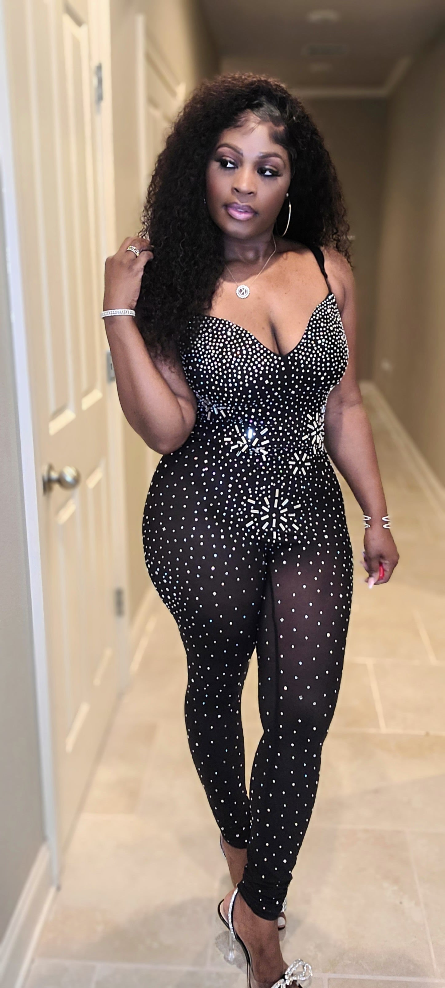 Be the Center of Attention!! Sleeveless Jumpsuit  Beaded Design  Adjustable Straps Great Stretch  Undergarment Attached in Jumpsuit  Model wearing a Medium