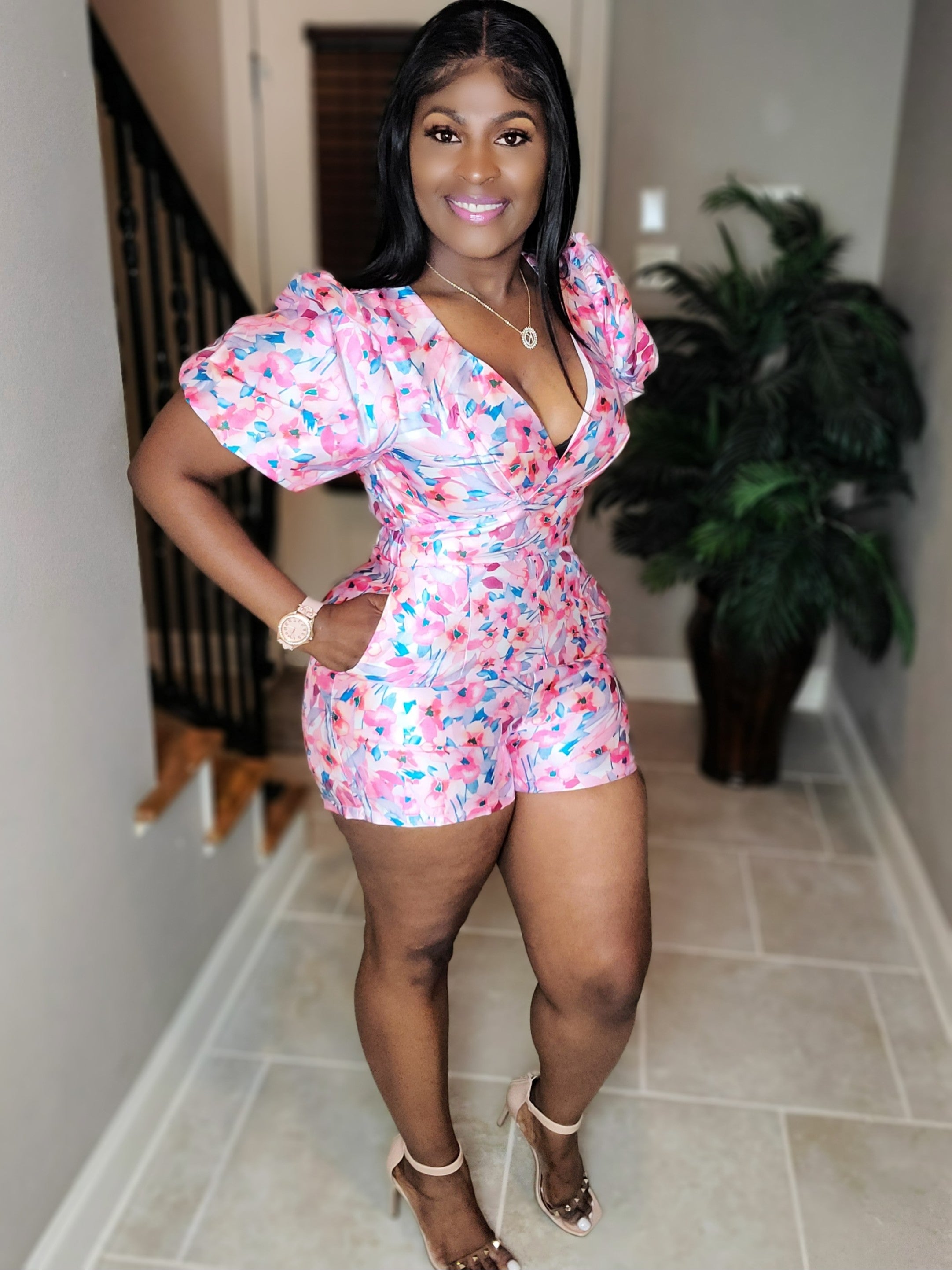 Pink Floral print Jumpsuit with a V-Neck, Short Puff sleeves, Romper Hem, zippered back, & all over floral print.