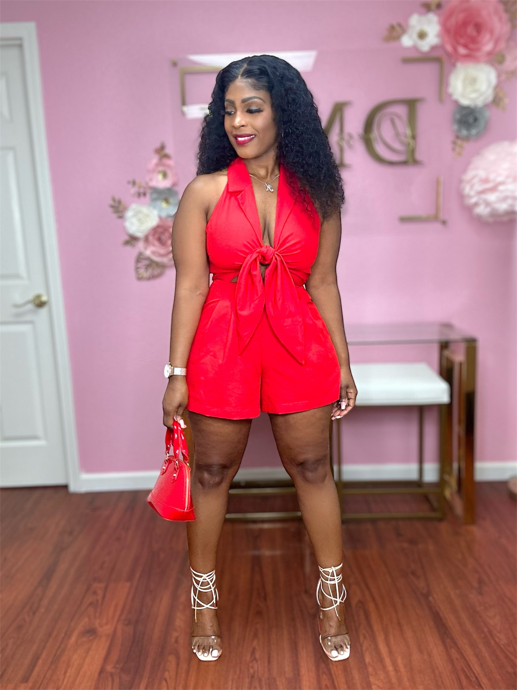 Red Short Style all into one RomperRed Halter Tie Front Playsuit Give a Flirty Look Halter straps have Hooks around the neck Mid drop back opening  Zipper closure in back Tie Front with open mid section area 97% Polyester  3%...