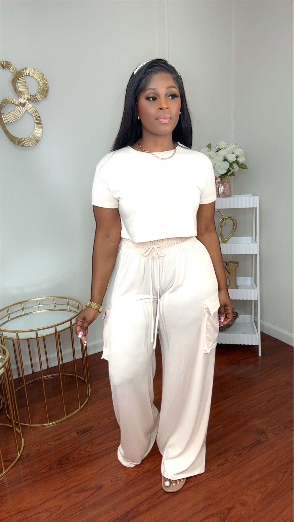 2 Piece Set Round Neck Crop Top Shirt Cargo Flare Legs Pants Elastic Waistband with Drawstring  Cargo Pockets Tall Girl Friendly  Model wearing a size Md. for baggier look but can also wear a Size Small see Size Chart for...
