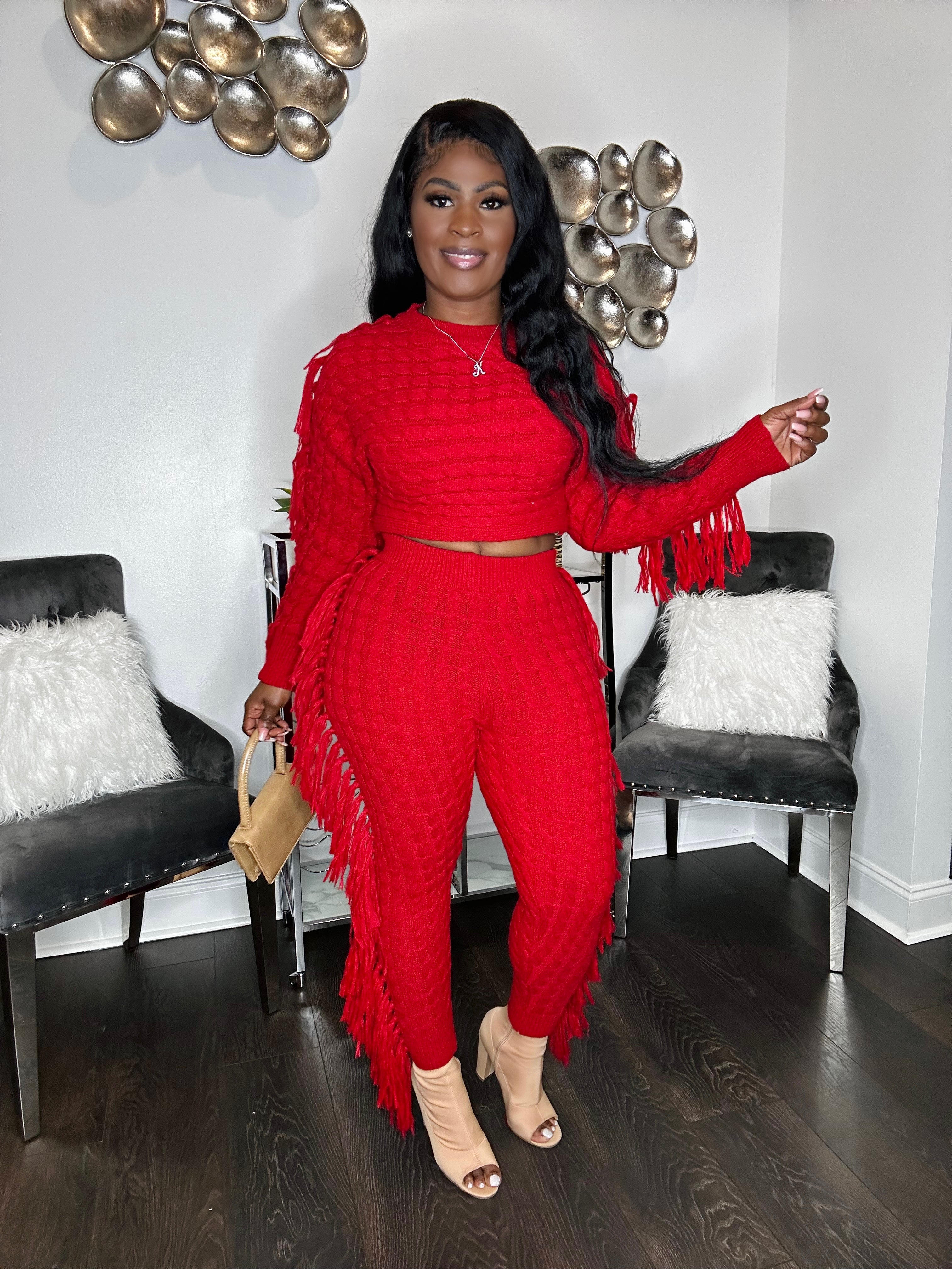 Casual Knitted 2 Piece Set Long Sleeve  Great Sweater Material  Tassel Set Elastic Waistband with Some Stretch (Black Set Runs a little Bigger) Model wearing a Small Set