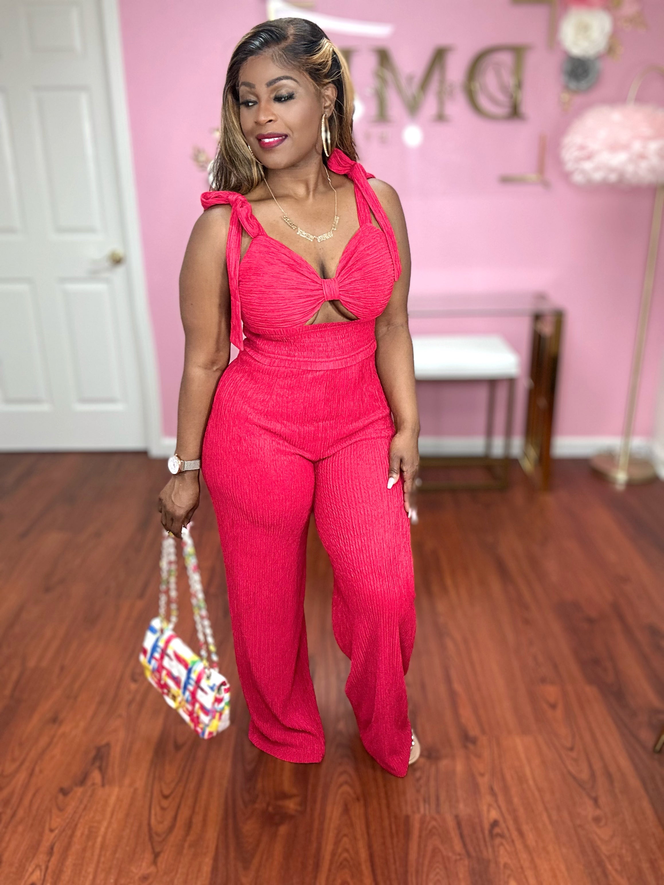 Fiona Color Self Tie Shoulder Strap Jumpsuit  Zipper in Back Flare Wide leg Pants Soft Material  Model wearing a Medium  Check Size Chart for Model Size & Clothing Size Measurements
