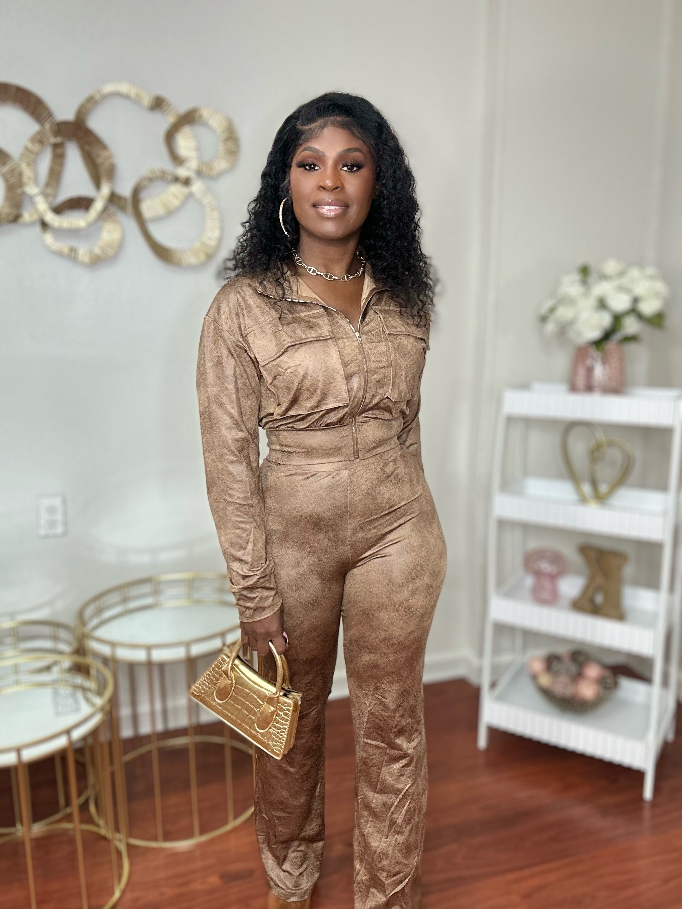 A stylish two-piece featuring a soft, distressed faux-leather look that blends comfort with bold streetwear energy. • Zip-front jacket with a sleek collar and long sleeves • High-waisted flare pants that elongate the legs • Stretchy, comfortable fabric with a...